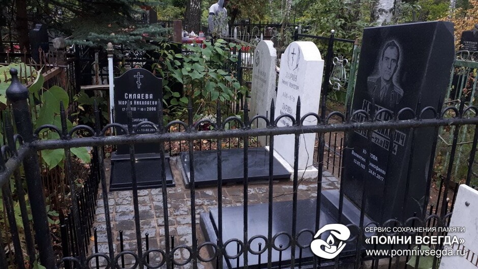 Затем почистили мраморный памятник, который стал на порядок светлее. Восстановили позеленевшую надпись. На гранитных памятниках выгравировали ещё по одной надписи (шрифт заказчик пожелал использовать самый обычный), покрасили ограждение. Так выглядит участок после всех проведённых работ.