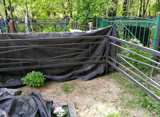 На фотографиях видно, как мы готовим оградку к покраске. Перед началом проведения работ мы обязательно укрываем плотной тканью как участок клиента, так и окружающие его места захоронения, чтобы случайно попавшая на памятники краска не создавала лишних проблем.